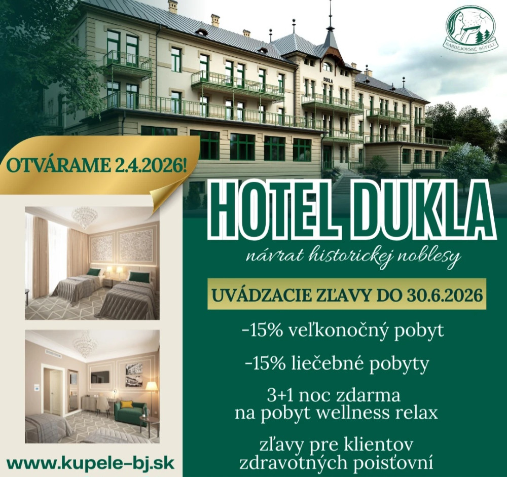 Hotel DUKLA***+, novozrekonštruovaný kúpeľný hotel, ponúka moderné ubytovanie v príjemnom prostredí Bardejovských Kúpeľov s dôrazom na komfort, funkčnosť a kvalitné služby. Hotel, národná kultúrna pamiatka, je historická budova postavená v roku 1895 v štýle neskorého historizmu, ktorá slúžila ako liečebný dom do roku 2002. Po kompletnej rekonštrukcii sa dnes vracia k svojej pôvodnej noblese a opäť otvára svoje brány hosťom. Súčasťou hotela je recepcia, lobby bar, kaviareň, fajčiarsky salónik (smoking room), úschovňa batožiny a spoplatnené parkovisko. Hotel momentálne nie je prepojený spojovacou chodbou s ostatnými hotelmi, Wellness Spa a Balneoterapiou. Po otvorení však začne výstavba prístavby hotela, ktorej súčasťou bude aj spojovacia chodba, čím sa hosťom zabezpečí ešte väčší komfort pohybu v areáli kúpeľov. Hotel je ideálnou voľbou pre hostí, ktorí hľadajú nové, komfortné ubytovanie v kúpeľnom prostredí s výborným zázemím pre liečebné aj wellness pobyty.