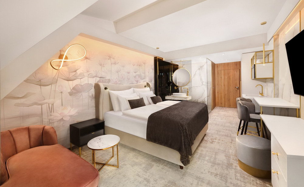 Jedinečný pocit luxusu a súkromia: apartmán ponúka vlastnú vírivku na terase či balkóne. Južná orientácia a vysoký štandard vybavenia robia z tohto typu izby výnimočný pobyt pre pár alebo hosťa, ktorý chce „niečo navyše“.