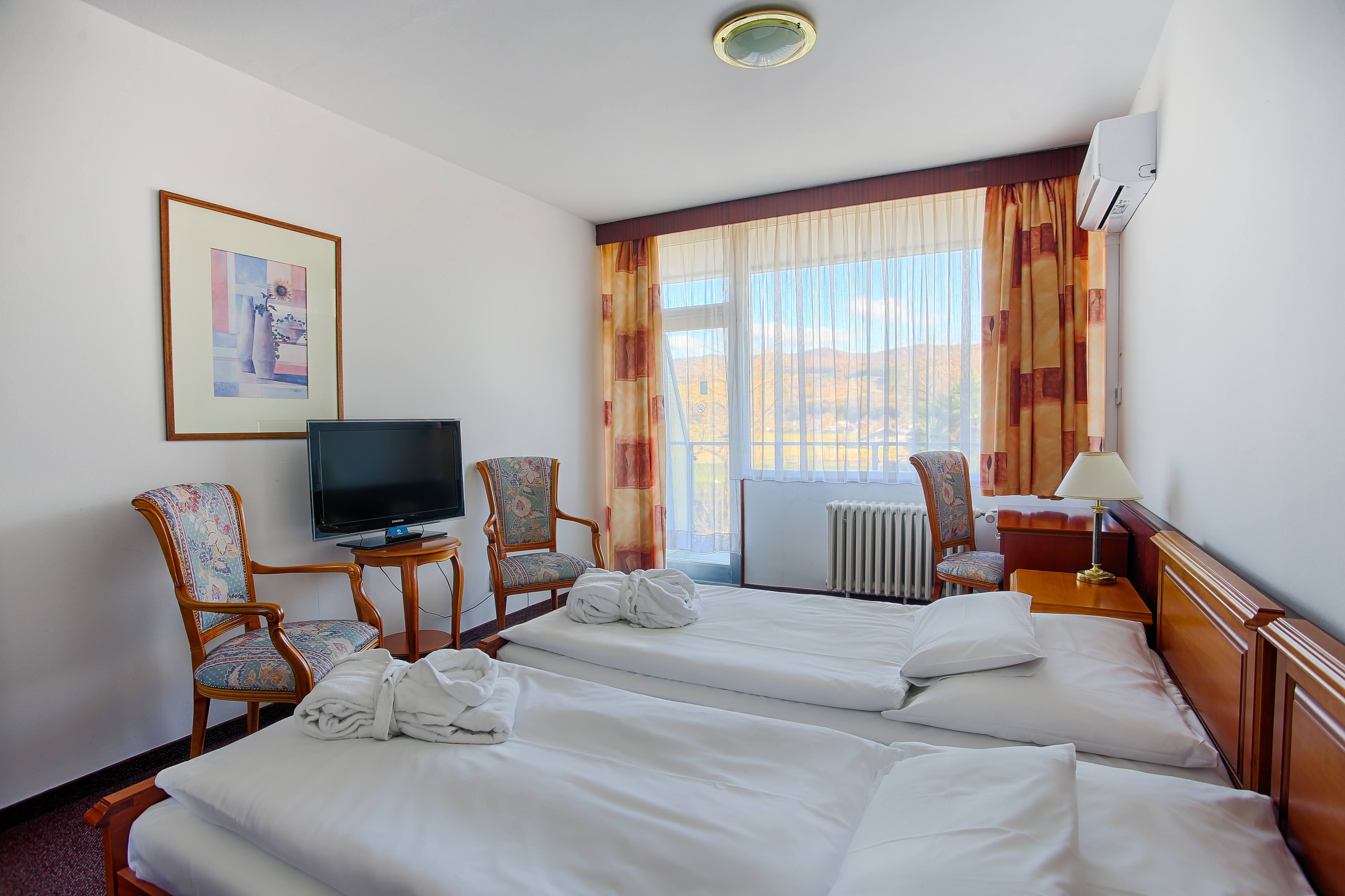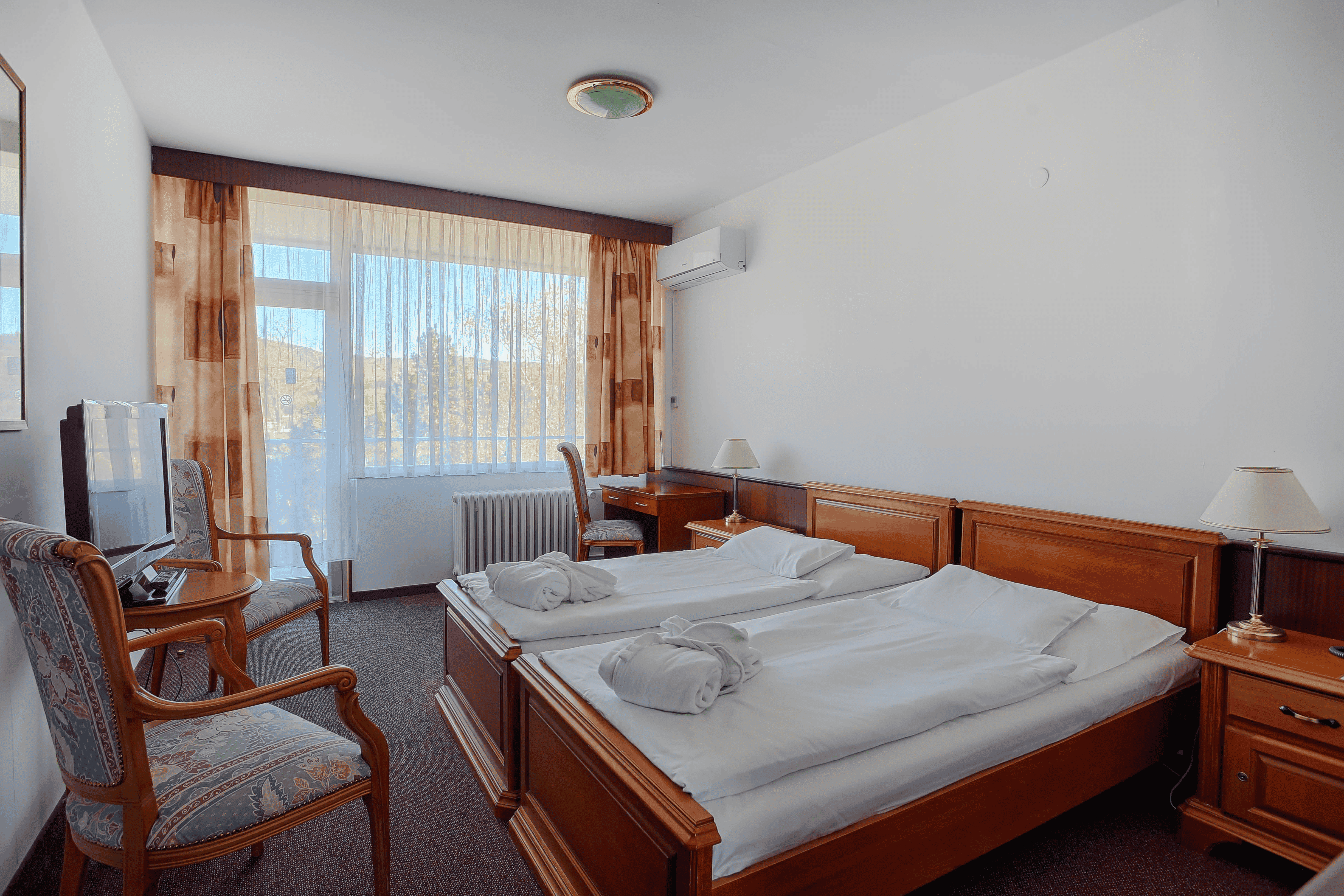 Komfortní dvoulůžkový nekuřácký pokoj s pokoj s manželskou postelí (možnost přistýlky), skříň, pracovní stůl, křesla a stolek, LED TV (kabelové a rozhlasové programy), telefon, minilednička, trezor, nástěnné zrcadlo a koupelna s vanou, WC, kosmetické zrcadlo, vysoušeč vlasů a toaletní potřeby, lázeňské ručníky. Pokoje s klimatizací za poplatek. - Apartmán