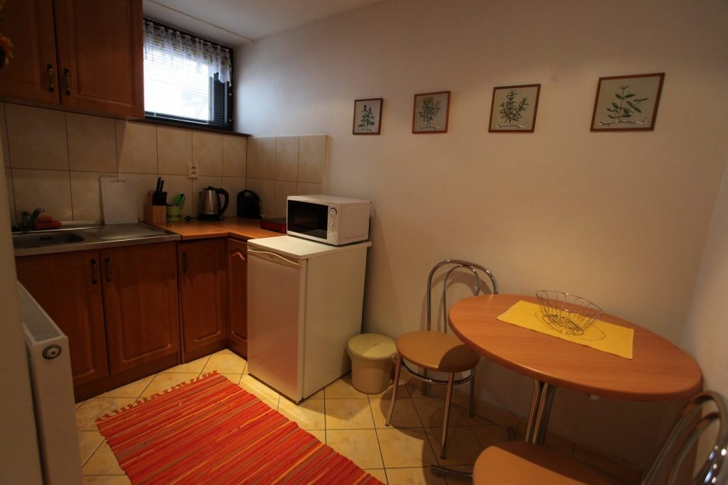 V plne vybavenej spoločnej kuchyni (kuchynský riad, plynový sporák, chladnička, mikrovlná rúra atď.), v prípade záujmu je možné doobjednať si za príplatok kontinentálne raňajky. Ďalšia možnosť stravovania v okolitých reštauráciách.