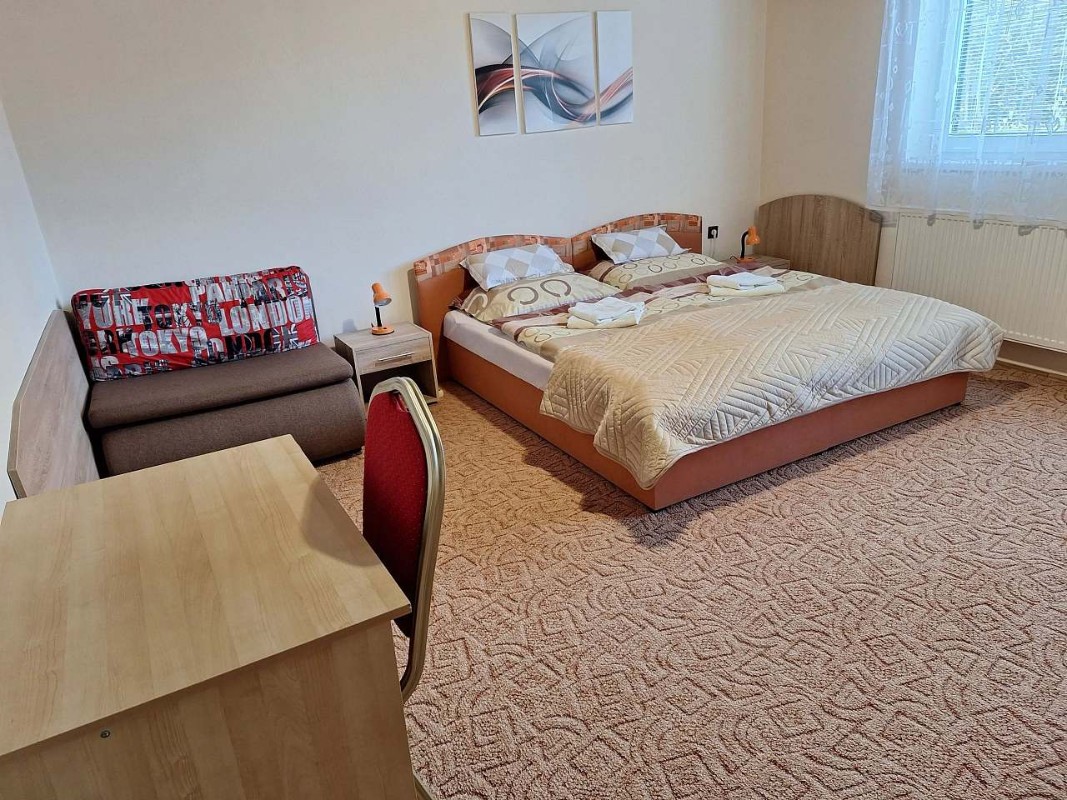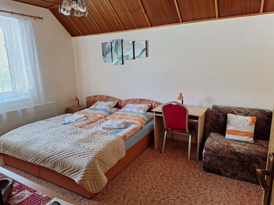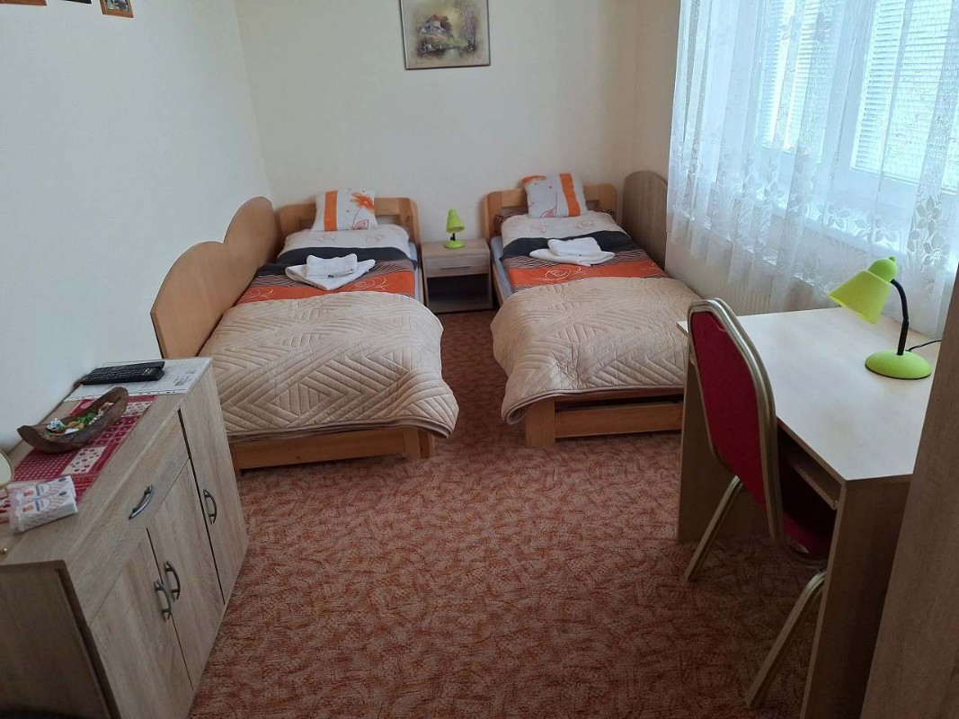 Táto izba má dve samostatné postele, ktoré je možné podľa potreby spojiť na manželskú posteľ. Je vybavená skriňou, nočnými stolíkmi, TV/SAT a dostatočným priestorom na pohodlné ubytovanie dvoch osôb. Hosťom je k dispozícii Wi-Fi. - Kúpeľne a toalety