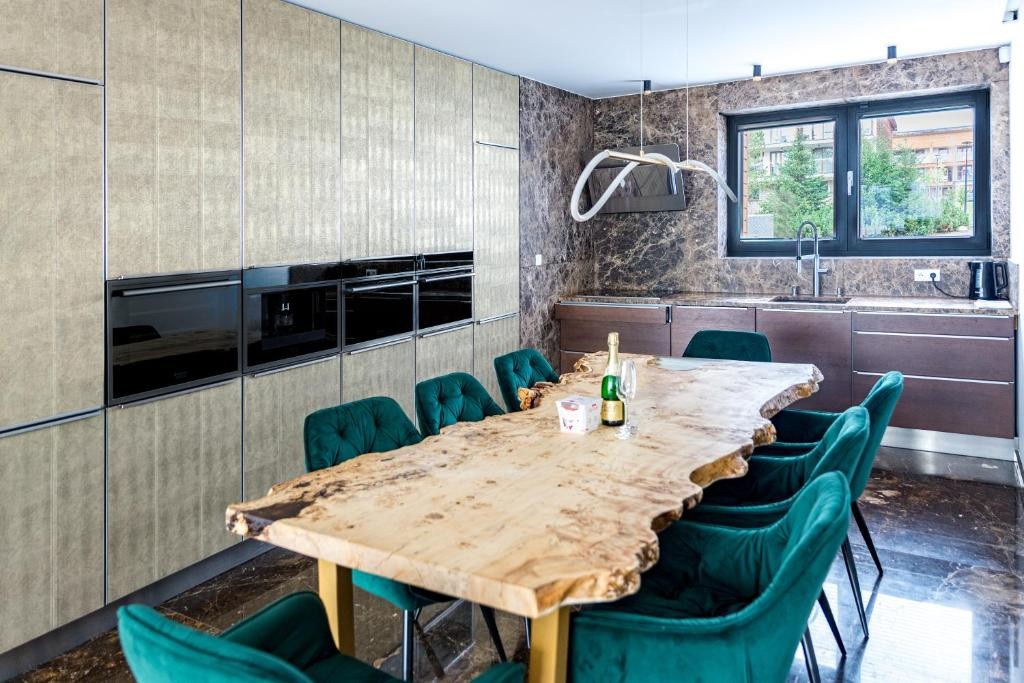 Stravovanie nie je priamo súčasťou ubytovania a vila disponuje spoločným plne vybaveným kuchynským kútom (detská vysoká stolička, chladnička, vstavaný kávovar, mikrovlnná rúra, rýchlovarná kanvica, umývačka riadu, rúra, sporák, vstavaná chladnička na víno / vinotéka, jedálenský stôl), v ktorom si hostia môžu pripravovať vlastné jedlá. V blízkosti rezidencie sa však nachádzajú reštaurácie a kaviarne, kde si možno vychutnať tradičnú slovenskú kuchyňu i medzinárodné jedlá (Reštaurácia Sosna 700 m, Reštaurácia Penzion Pleso 4,9 km, Reštaurácia Furkotka 4,3 km).